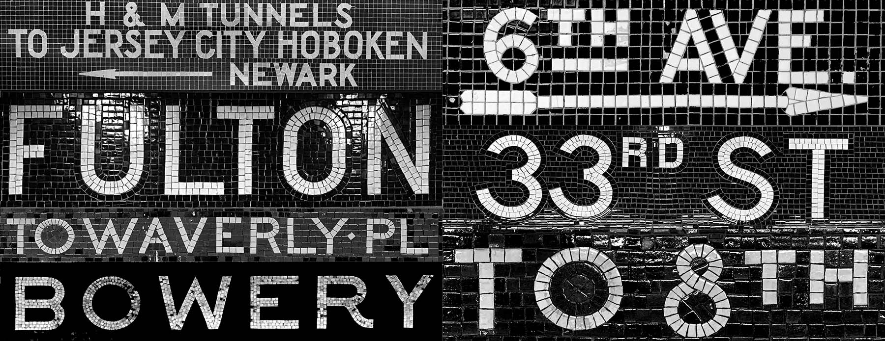 Name Sans is a modern interpretation of the mosaic name tablets of New York City subway stations.