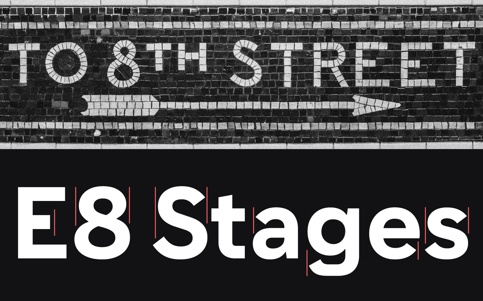 One of my long-time favorite mosaics in the system is a sign at the Wall St 4/5 station that directs riders to the Equitable Building. Its letters are among the most purely geometric and the resulting rhythm is pretty wild. While Name Sans demanded more regular proportions, this sign inspired several key design decisions. The spur of the G